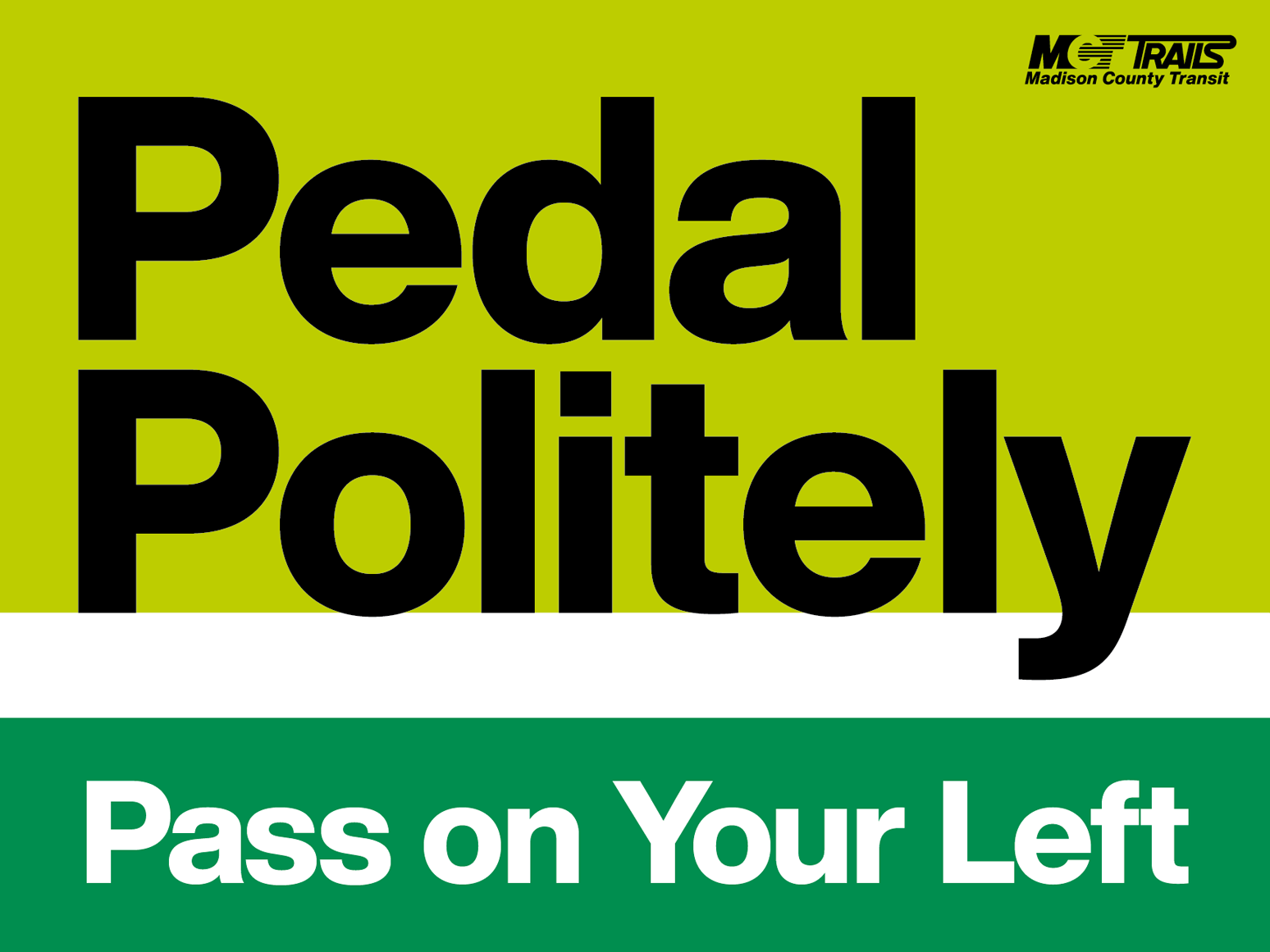 Help us keep the MCT Trails welcoming for everyone. Our “Pedal Politely” yard signs highlight simple trail etiquette reminders—like sharing the path, passing others on the left, and maintaining a speed of 15 MPH or under.
