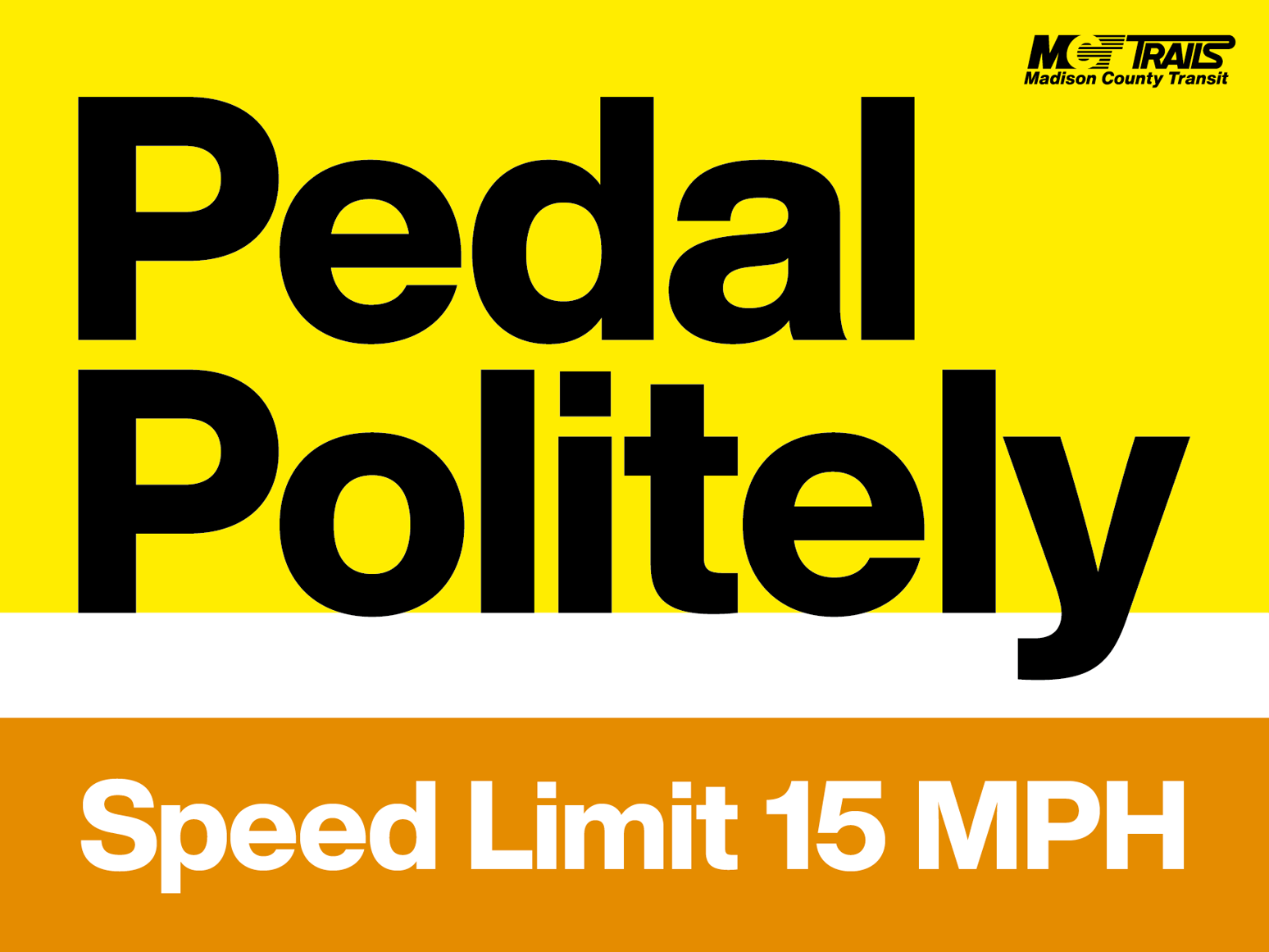 Help us keep the MCT Trails welcoming for everyone. Our “Pedal Politely” yard signs highlight simple trail etiquette reminders—like sharing the path, passing others on the left, and maintaining a speed of 15 MPH or under.